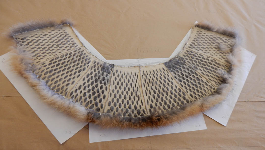 this fox collar has been cut in the “air gallon” method, then stretched into shape following a pattern draw on the white sheets of paper.