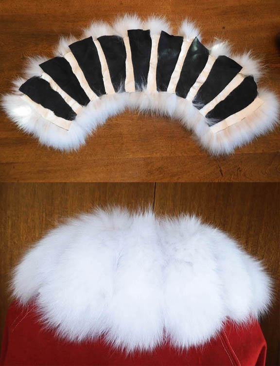 The top portion of the photo shows the underside of the collar during construction. The bottom portion shows the finished collar. The arctic fox fur is so full and dense, one barely sees the black leather in the "grooves". |