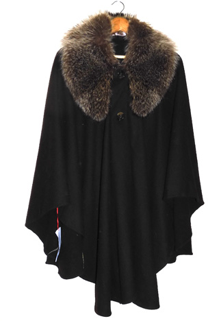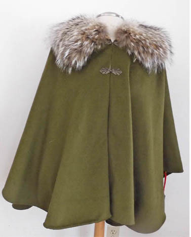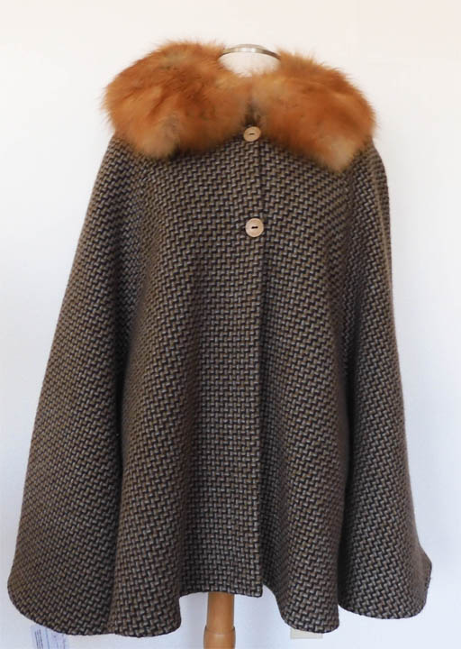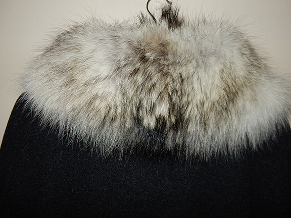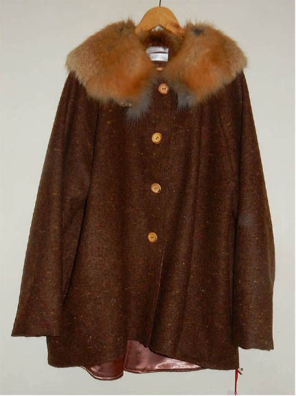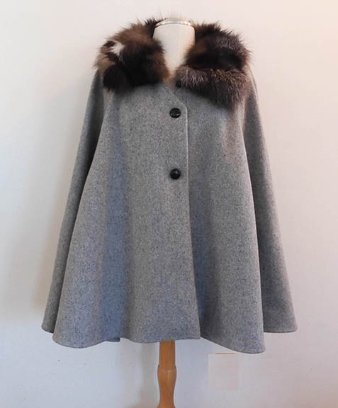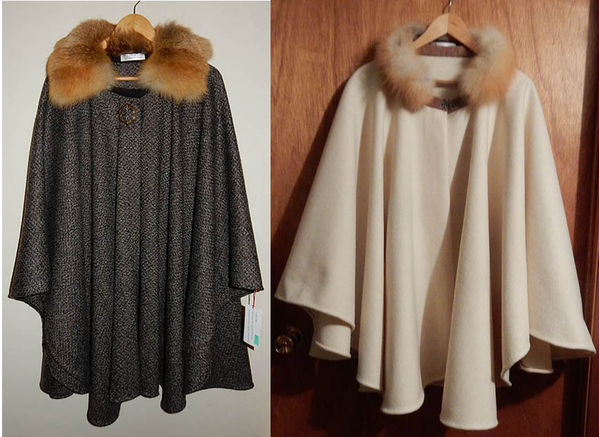 The air gallon collar, left, was used on this light wool fall jacket. In comparison, a tradtional red fox collar was used on this heavy coat weight wool tweed sleeved cape (right). Each has it’s place. |