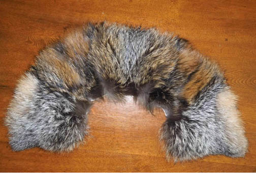 Deciding what style to make depends on your personal preference and the type and amount of fur you want to use. As an example, from one red fox, one can easily make an ample (5” deep) round or “Quaker” collar from the lower body and probably a solo standup collar/neckpiece from the shoulder region, with the soft underbelly fur remaining. This soft grey/white/reddish fur might work as trim on certain things such as cuffs on mittens or sweaters.
