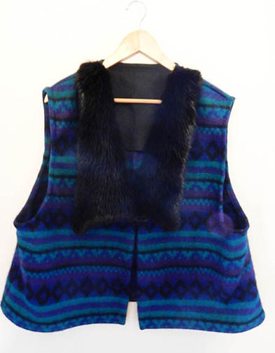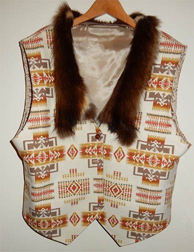 Fur collars that fit V necklines are common on the vests I make. The narrow detachable fur collar on the Pendleton wool vest, left, is fisher. Fisher is not a long-haired fur, and therefore also appropriate for an indoor garment. Sometimes I use only fur lapels, not full collars, as shown on the Blue print vest, right. The lapels are beaver, dyed black. |