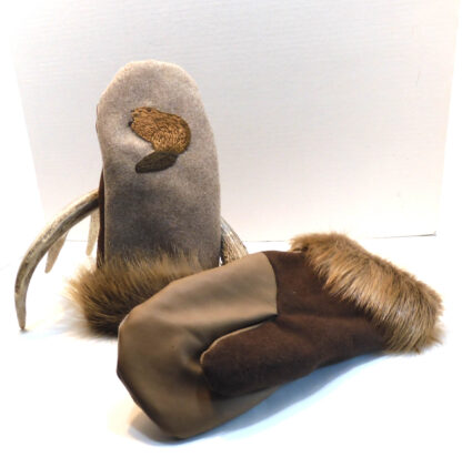 A hand-embroidered Beaver adorns each of these mittens. The beige uppers are 80% wool/ 20% other. The palm is taupe leather with dark brown wool fabric below. They are lined in soft wool interlining. The cuff is natural beaver fur. Size Men’s Medium to Large.
