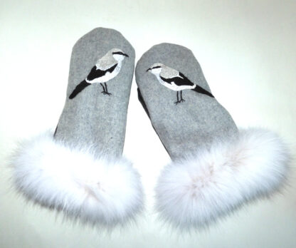 A hand-embroidered pair of Northern Shrike adorns these mittens. The pale gray colored uppers are 80% wool/ 20% other. The palm is natural black leather with charcoal gray wool fabric below. They are lined in soft wool batting . The cuff is natural arctic fox fur. Size Women’s Medium to Large.